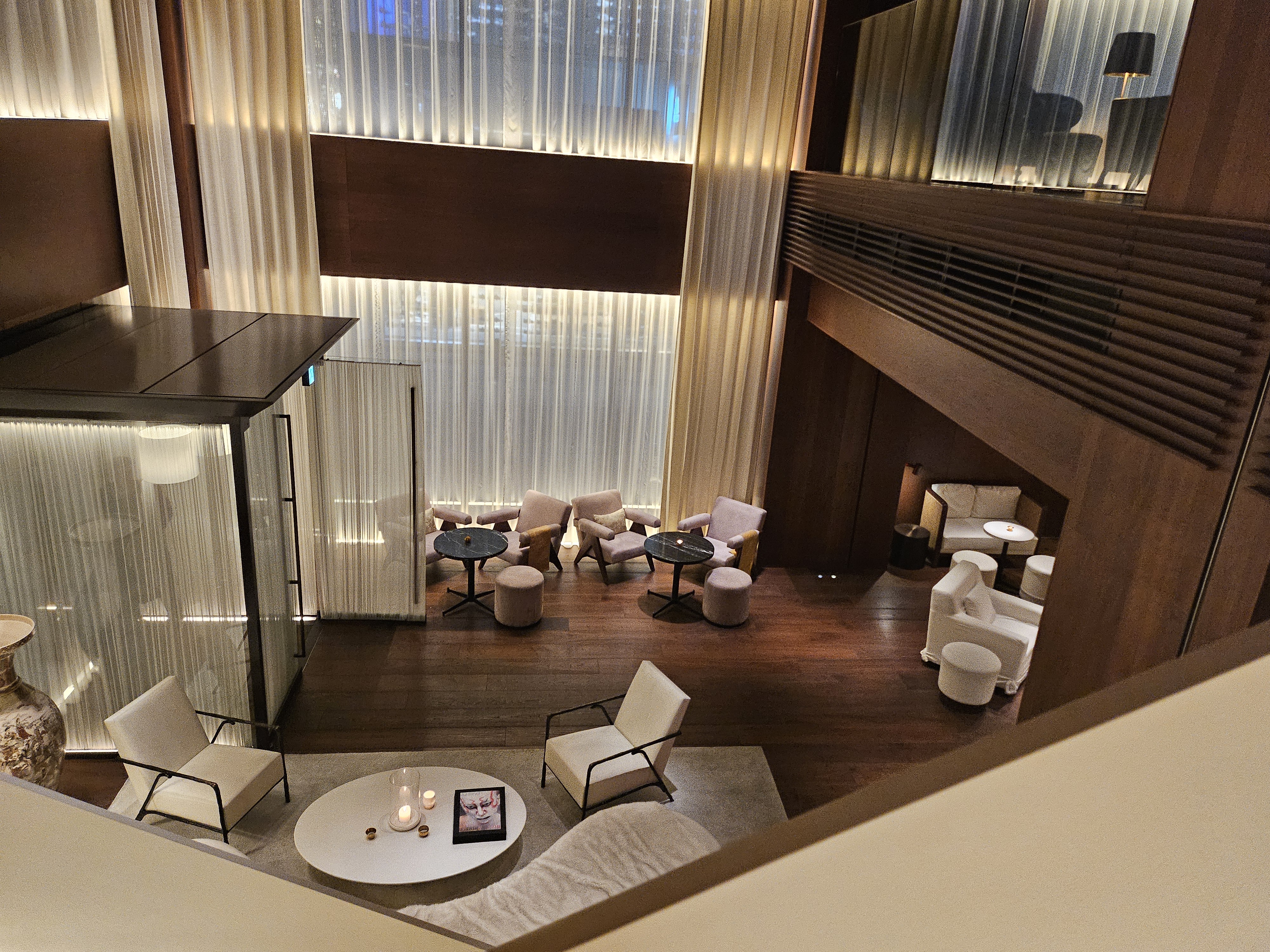 갤러리인가? 싶은 진중한 분위기 속에서 비일상적인 라운지 음악이 꽉 찬 곳이다. 계단을 올라가며 음악이 더 가까이 들리는 와중에 이 어둑하고 진중한 공간을 마주하자마자 흥분이 고조되는 느낌; 이 파티 분위기와 언발란스하게 차분하고 럭셔리한 배경은 뭐지?